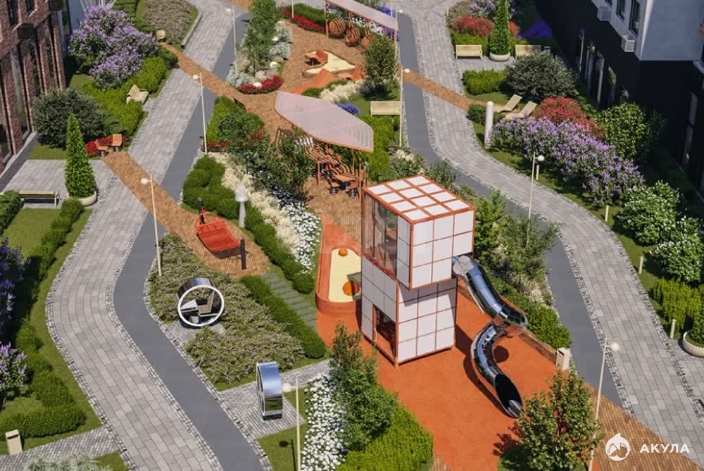 Это камерный квартал, где современные технологии гармонично сочетаются с природным окружением. В проекте предусмотрен муниципальный детский сад на 100 мест и зелёная городская гостиная для жителей.