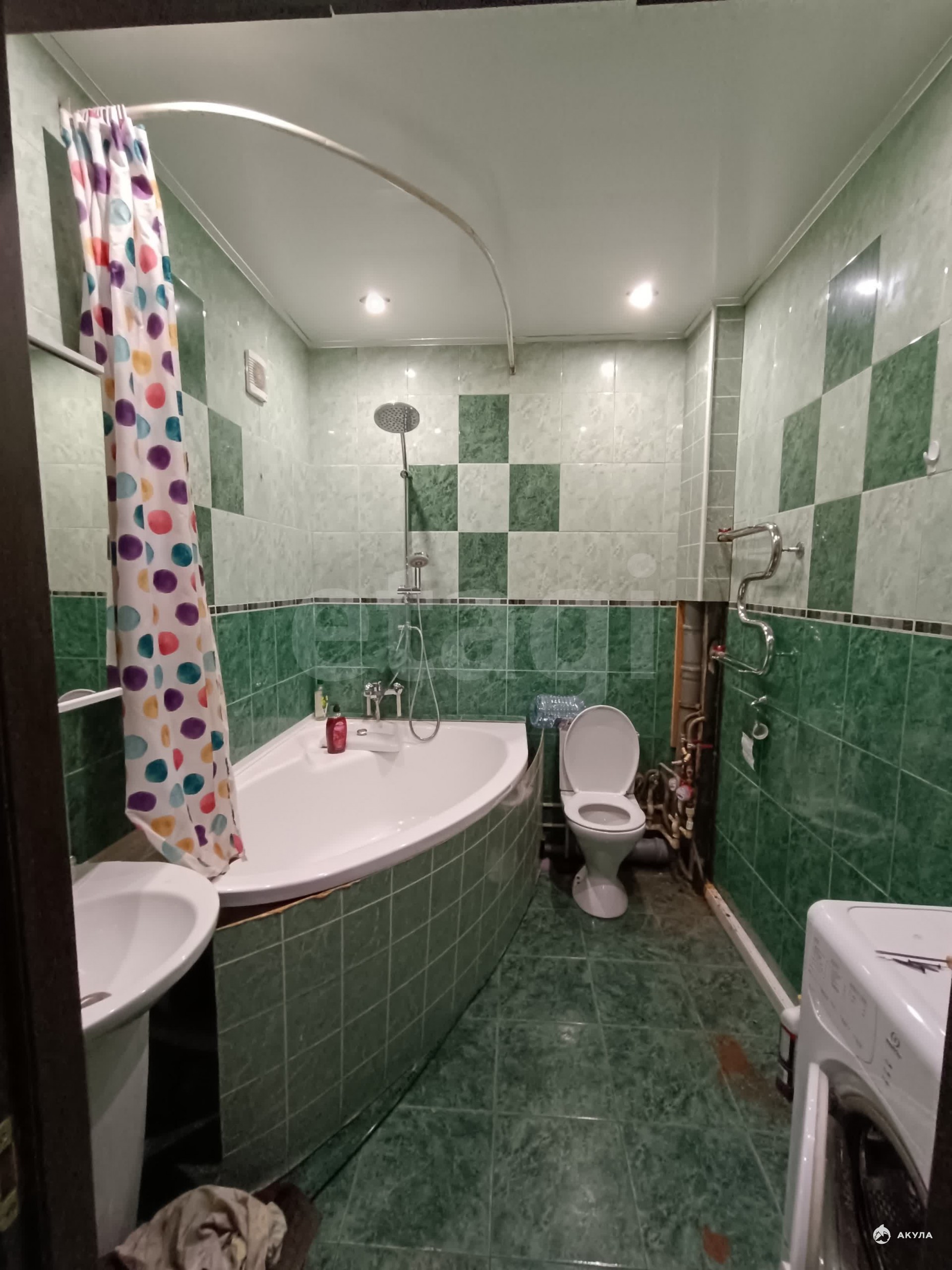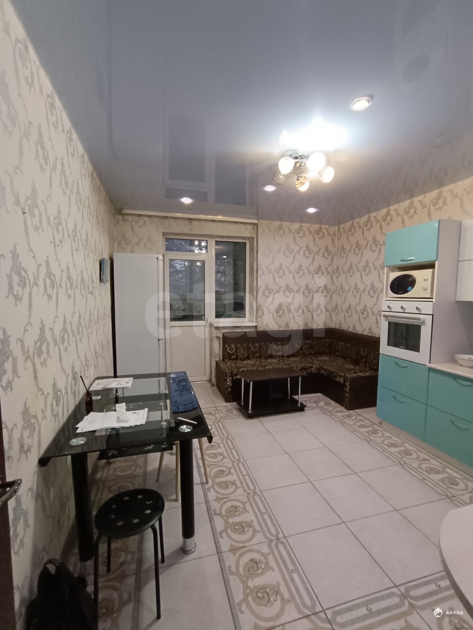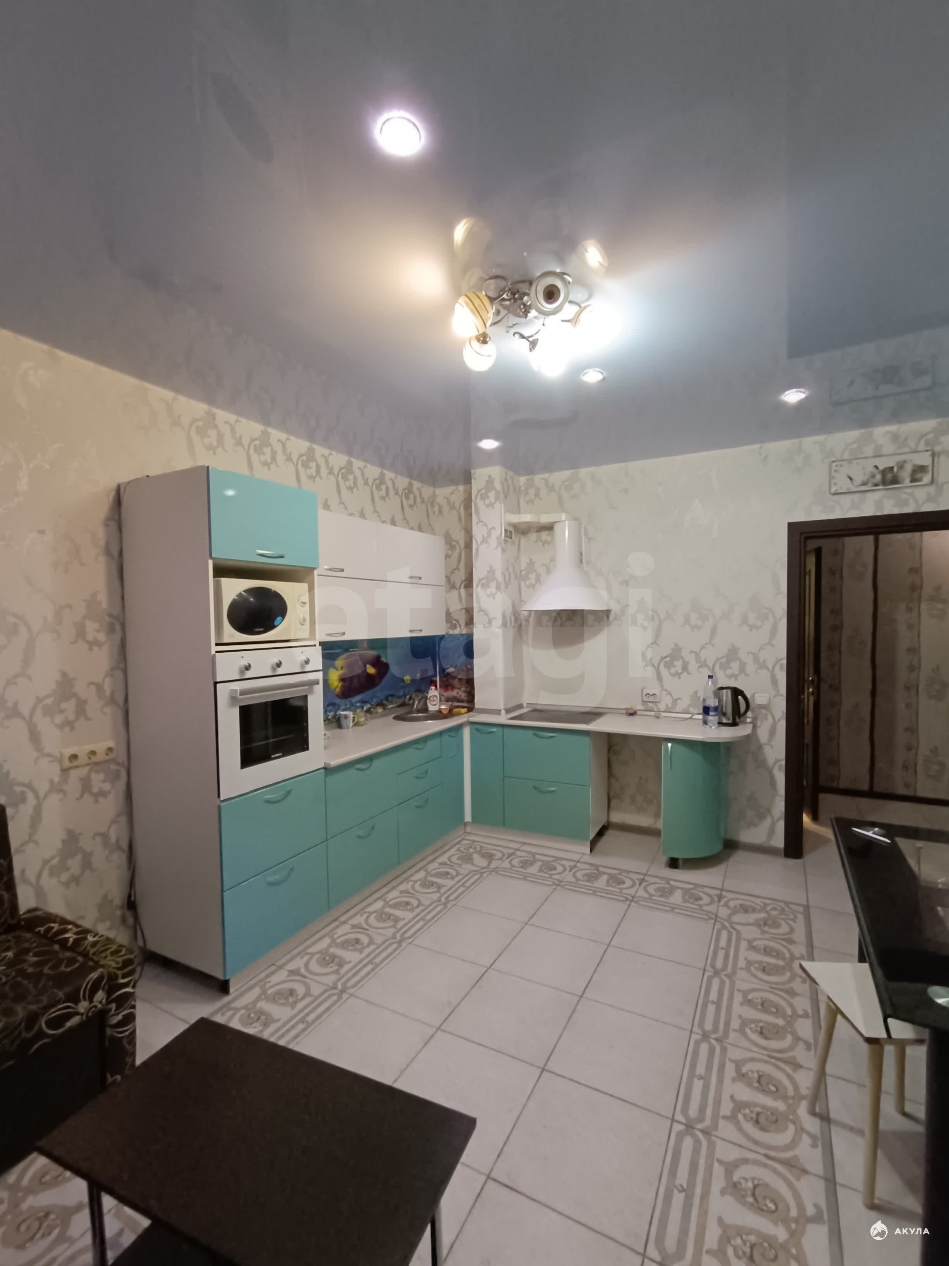Есть вся необходимая техника и мебель: диван, стенка, компьютерный стол, кухонный гарнитур, обеденный стол, угловой диван на кухне, прихожая, холодильник, плита, духовой шкаф, микроволновка, вытяжка, чайник, стиральная машина, утюг.