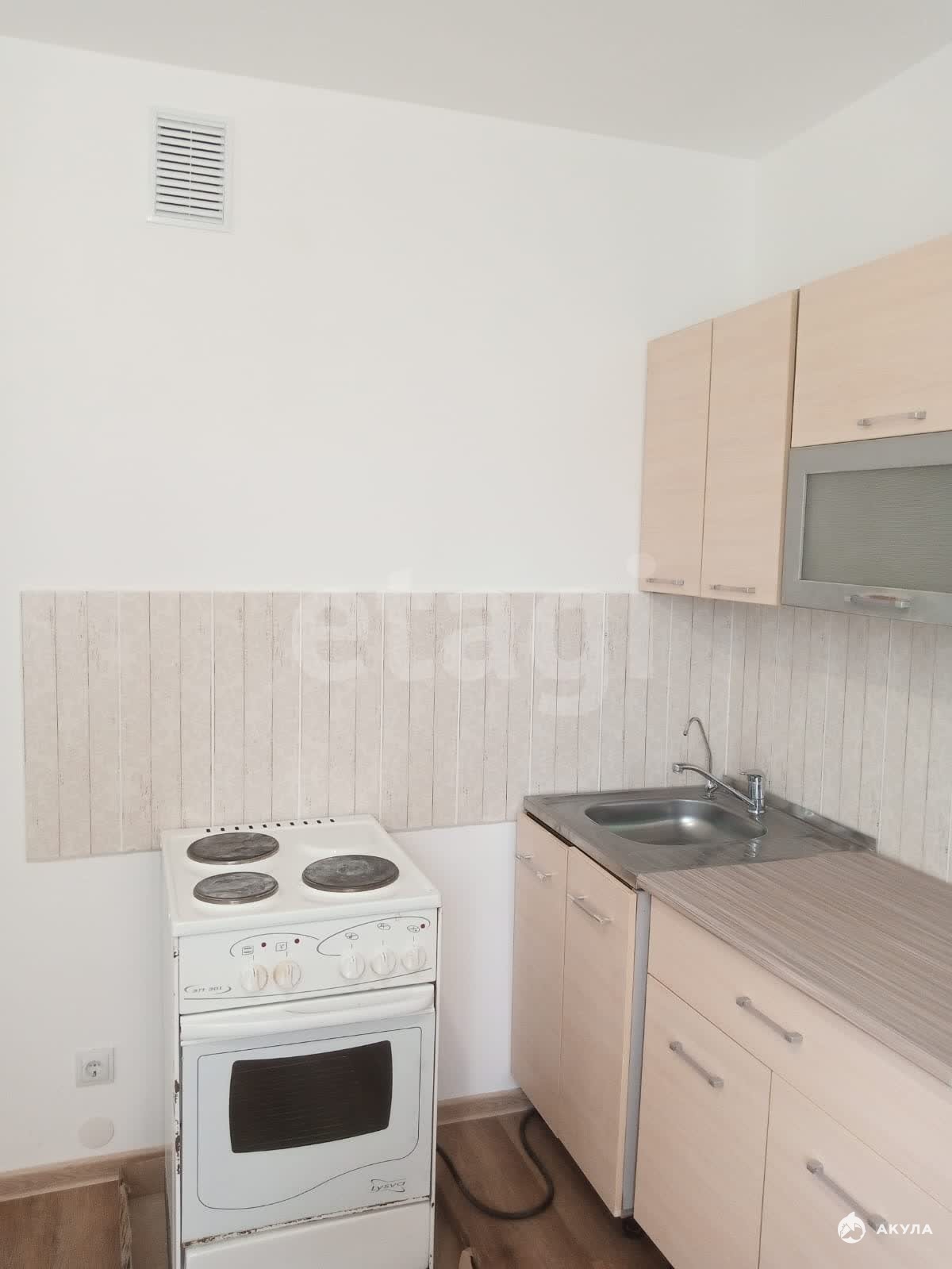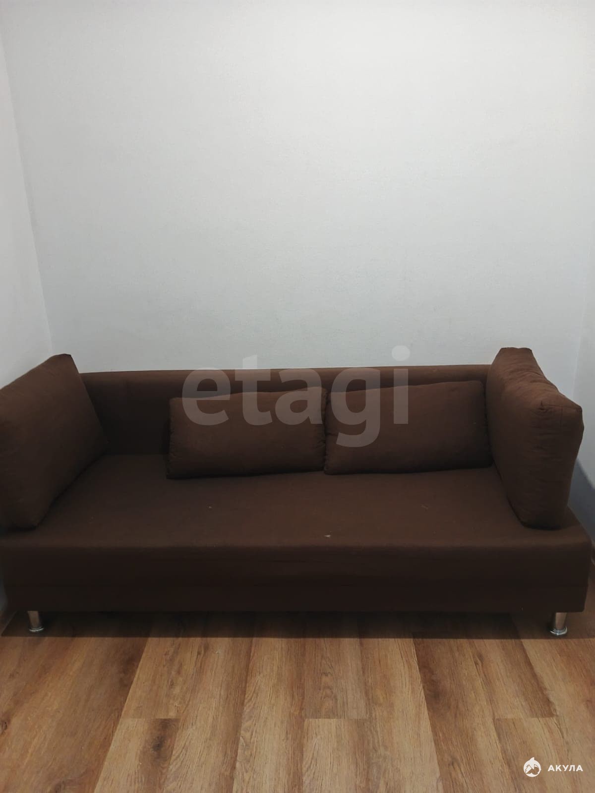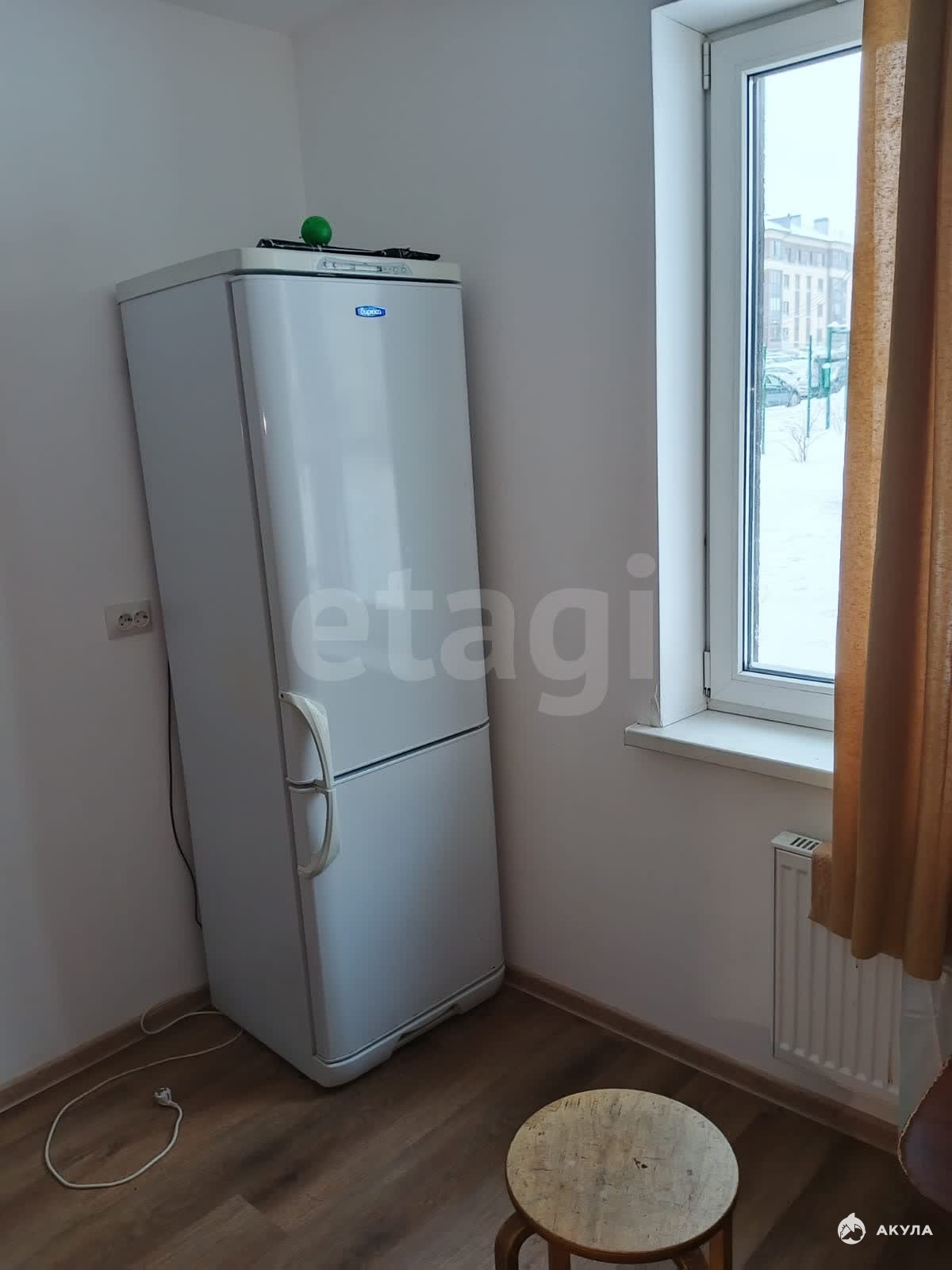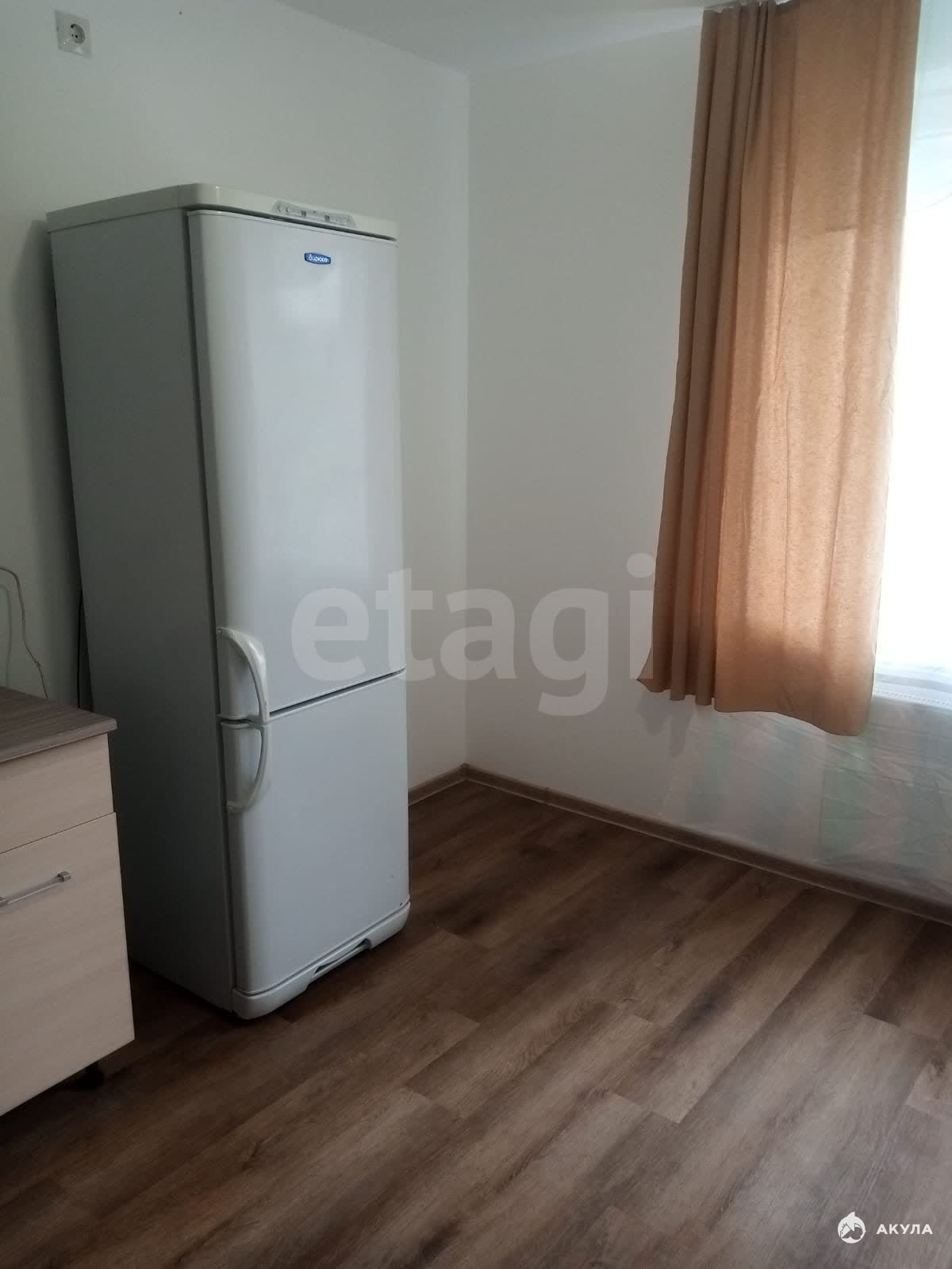 Есть необходимая мебель и техника: кухонный гарнитур, холодильник, стиральная машина, шкафы, диван.