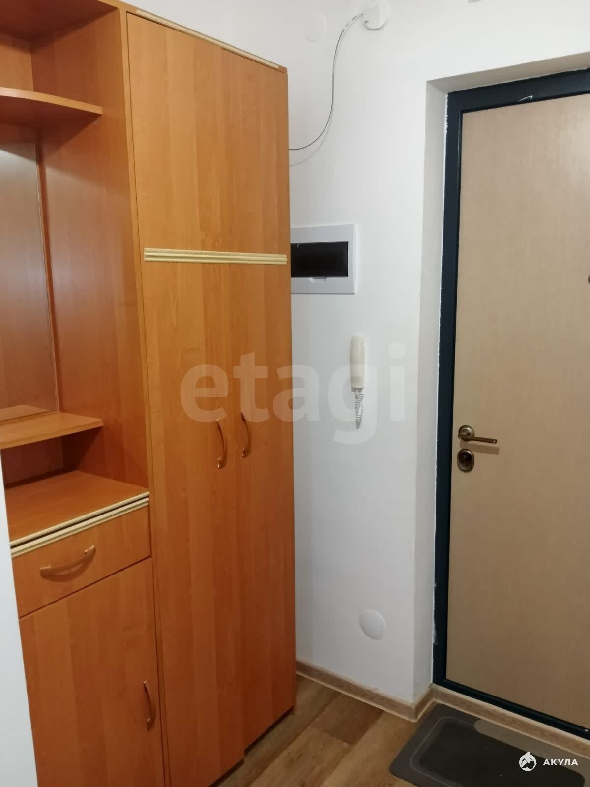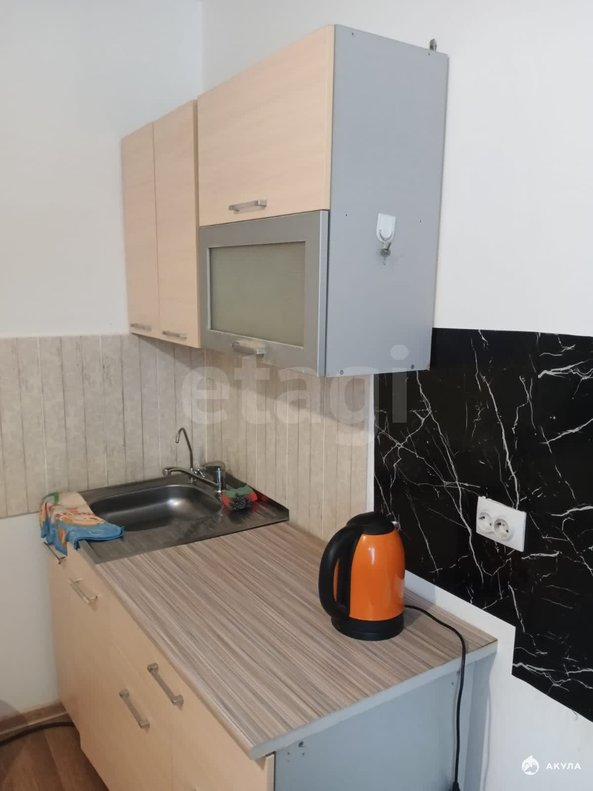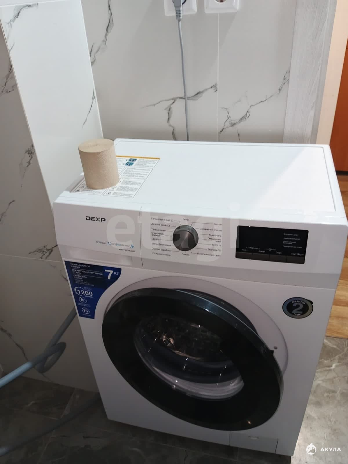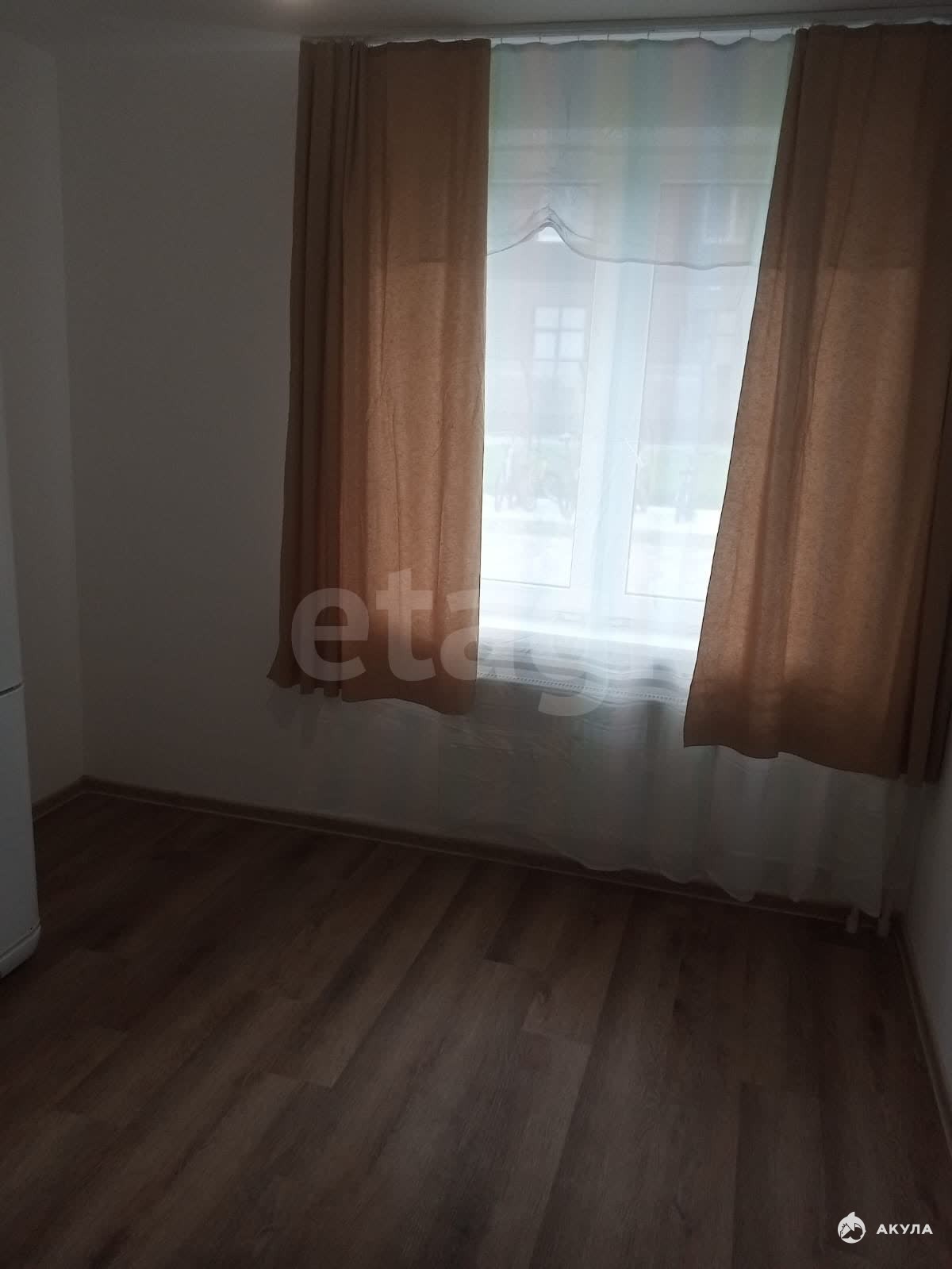 Есть необходимая мебель и техника: кухонный гарнитур, холодильник, стиральная машина, шкафы, диван.