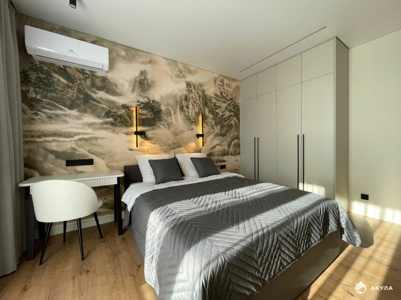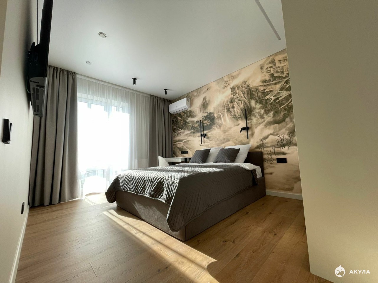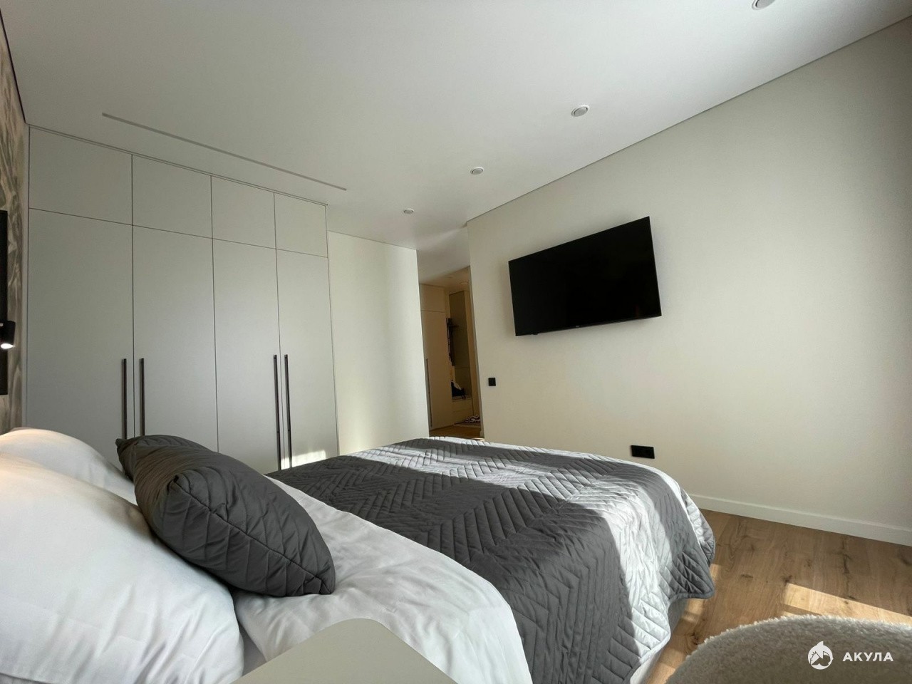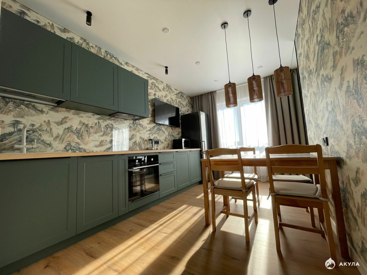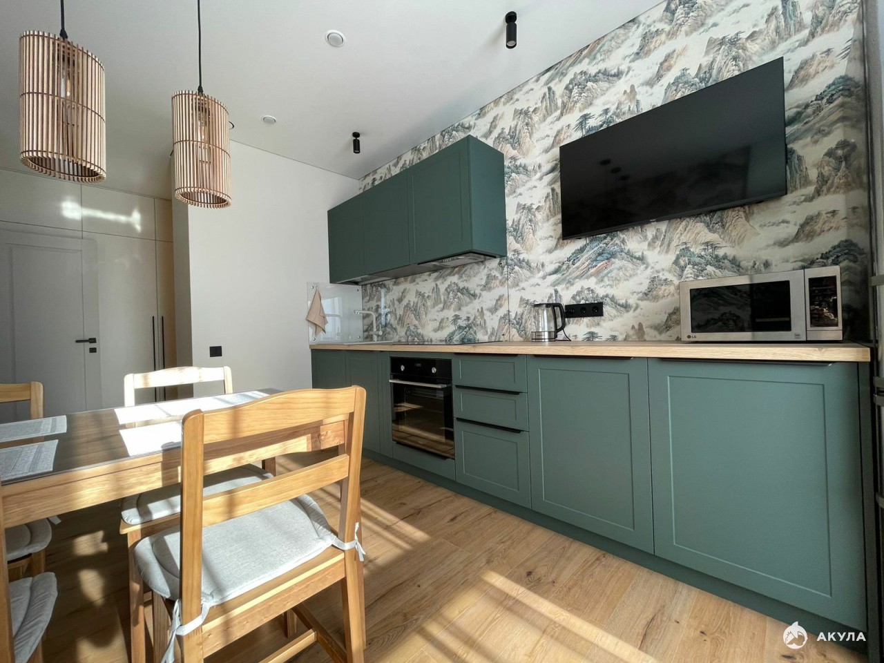 На кухне установлен кухонный гарнитур, варочная поверхность и духовой шкаф, микроволновка, посудомоечная машина, холодильник, телевизор и кондиционер.
