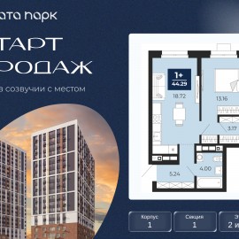 Просторная 1-комн. квартира с предчистовой отделкой в ЖК "Соната Парк" на 2 этаже. Общая площадь: 44.29 кв.м., жилая: 13.16 кв.м., площадь просторной кухни-столовой: 18.72 кв.м. Все окна выходят на одну сторону. В квартире один совмещенный санузел. Высота потолков 2.72 м. Дом монолитный,...