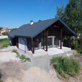 г. Дегтярск. Жилой поселок МЕЖГОРЬЕ. В продаже строящиеся и готовые домовладения, а также земельные участки с подрядом. В одноэтажном проекте Норд - совмещенная кухня – гостиная с выходам на итальянскую террасу из палубной лиственницы, три спальни, 2 сан. узла, душевая,...