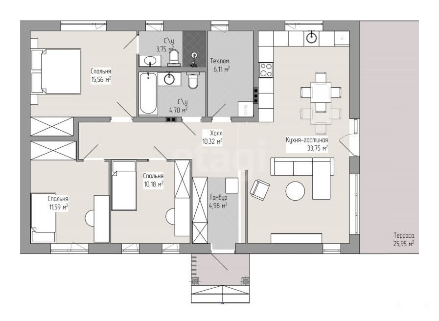 В комплектацию дома входит: внешняя отделка: штукатурка + камень, внутренняя отделка под чистовую, коммуникации, окна с ламинацией, терраса под крышей, отмостка, снегозадержатели, водоотвод с крыши.