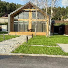Объект № 191881. Продам новый экодом из оцилиндрованного бревна 300 мм. Дом 63 м2. Две просторные комнаты. Кухня - студия. Прихожая. Остается вся мебель. Участок 4 сот. Баня, беседка, подсобное помещение. Вода, септик, электричество 380. К участку подведен газ. Двор вымощен...
