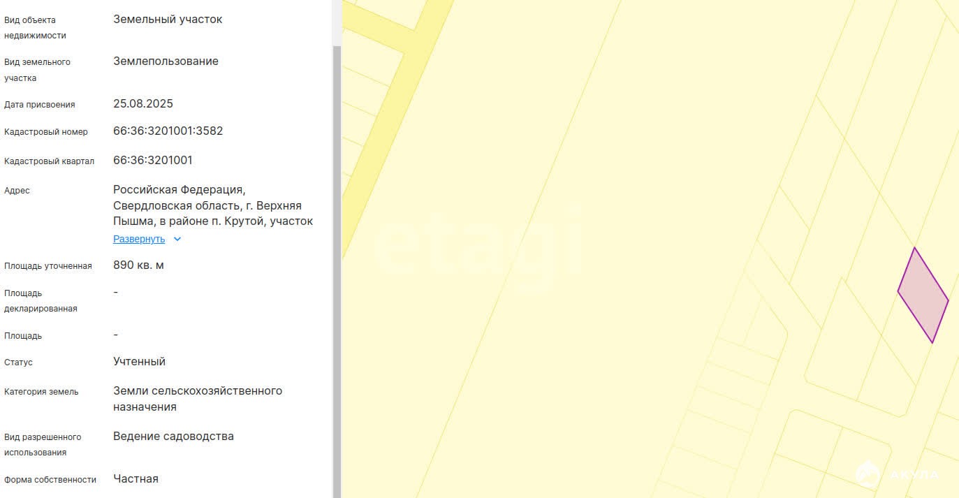 Земельный участок площадью 8, 9 сотки расположен в товариществе «Луговое» Верхнепышминского района.