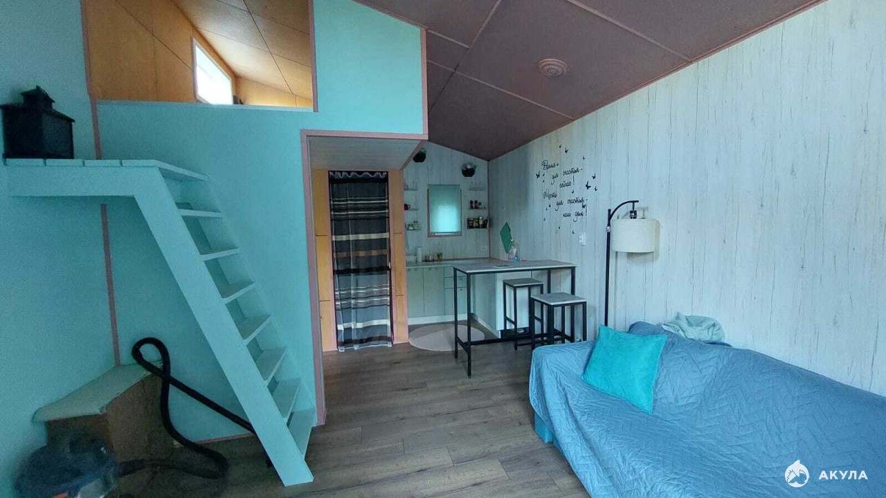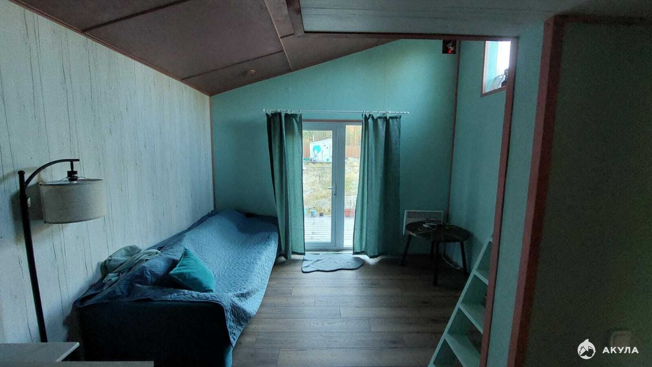 Дом построен из сухой строганной доски 50/100 мм, утепление Кнауф 100 мм, внешняя отделка -имитация бруса, крыша-ондулин, внутренняя отделка-шлифованная обработанная фанера, цвет медовый, окна ПВХ поворотно-откидные 1200/1200 и 600/600, входная дверь металлическая. Терраса - сухая строганная доска, обработанная маслом. Все дерево обработано огнебиозащитой.